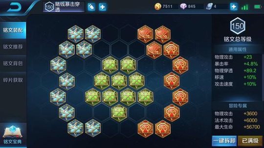 铭文解析:狩猎增加移速和一定的攻速,鹰眼和异变加成,加上3个祸源的暴击率是非常不错的。