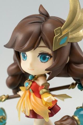 近看大乔,肤色涂装白皙柔和,湛蓝的双眼好像凝视着眼前的人,评测君的小心脏扑通扑通跳。衣裙的细节看得更加清晰,胸前和袖子上装饰有半透明的橙色飘带,虽然是Q版尺寸但飘带的褶皱和飘动的形态也做得十分细致,大乔裙子上的金属感配饰和蓝色宝珠也得到了还原,因为Q版尺寸而显得更加精致。值得一提的是大乔手部微微抬起,手指的形态可爱又优雅,细节之处可见设计的用心。