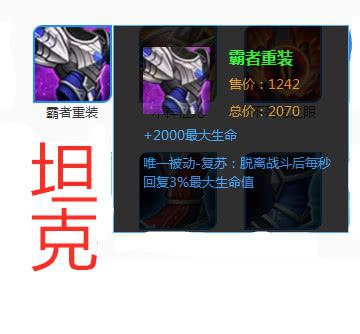 坦克也就是我们所说的肉盾,能抗能推线是坦克的绝对优势。而霸者重装能给玩家长时间的生命保障。坦克英雄在对战时候,能够为队友最大程度的分担伤害,并且脱离之后依然能够在战场中游走,迅速加入下一次战斗。对于坦克来说,这个装备就像是量身定做一般。