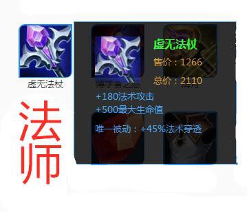 法师的攻击优势就在于穿透伤害,然后才是根据英雄自身机制所子所造成的吸血和被动控制效果。而虚无法杖就是所有法术输出玩家,在开局就会准备的基础法术装备。虽然很多法抗能够抵挡大幅的法术伤害,但是对于法穿几乎没有任何办法。这也是很多玩家给法师带铭文的时候,一定要堆穿透的原因。