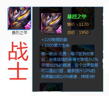 战士在对战中,往往担当的是推进带线的作用,生存机制比法师和刺客都好。在发育完全的情况下输出也很高。在前排作战的时候,会承担很多伤害,所以暴烈之甲的作用就能够将敌方打出的伤害反弹,同时大幅提升移速,让玩家迅速的成为压制方,无论是对线还是追击都有很大优势。
