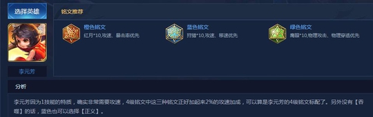 推荐理由:李元芳因为1技能的特质,确实非常需要攻速,4级铭文中这三种铭文正好加起来2%的攻速加成,可以算是李元芳的4级铭文标配了。另外没有吞噬的话,蓝色也可以选择正义。