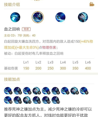 一技能:血之收割机,白起旋转镰刀对周围敌人造成附带自身最大生命值的物理伤害,在受到伤害时还有几率触发此技能。