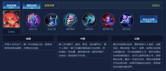 推荐理由:看阵容和个人喜好,冰霜法杖,增加技能“粘人”效果,如果队友控制比较强的话,可以换成嗜神之书,提升安琪拉生存和续航能力,也可以选择贤者之书,继续增加伤害;最后一件虚无法杖,增加法穿就算打肉也相当疼,如果对面输出比较多,容易被秒的话就出复活甲。