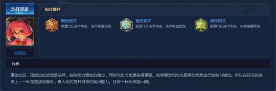 推荐理由:重做之后,虽然定位依然是法师,控制能力更加的稳定,同时攻击力也更变得更强。依靠爆发和攻击距离的优势进行控制与输出。所以在符文的选择上,一种是直接走爆发,最大化的提升自身的输出能力。还有一种为技能cd流。