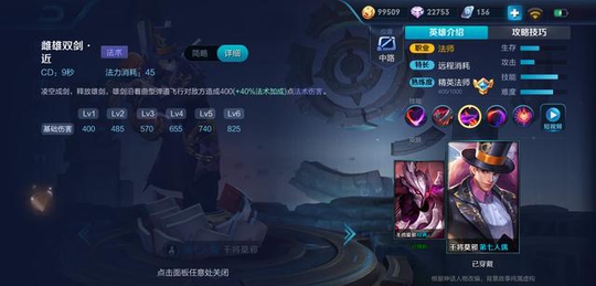 二、三技能:凌空成剑,释放雄剑,雄剑沿着曲型弹道飞行对敌方造成400(+40%法术加成)点法术伤害。