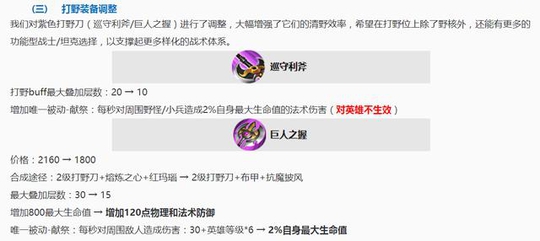 这次主要改动的就是紫色的肉打野刀,让打野位置有更多的可能性,像赵云,刘备之类的战士打野有了出场的机会,不过没法形成全是战士打野的主流,主流打野依然会是已刺客为主的英雄。