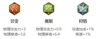这套铭文是为了前期能够提升雅典娜的gank支援能力和伤害能力才出的。异变和鹰眼的物攻和物穿加成能够最大成都的提升雅典娜前期的伤害。狩猎移速和攻速的加成为别为雅典娜的gank和技能连招使用的更顺畅!