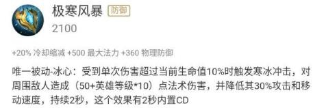③极寒风暴,俗称“冰心”,除了出色的防御加成,它最吸引人的地方就在于那20%的冷却缩减,光从这一点就能看出,冰心特别适合依赖技能的英雄,比如大多数法师和部分吃技能的战士。另外,冰心的被动能对周围敌人造成减伤和减速,这一点能够克制突脸型刺客和战士的输出,甚至有可能来一波反杀。