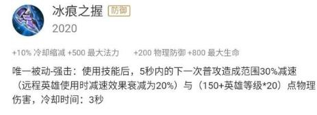 冰痕之握(减冷却,加生命、物理防御和法力值,被动造成伤害并减速)