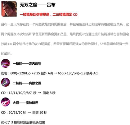 吕布减少了二三技能的CD,同时一技能的伤害进行了调整,使得吕布不会在前期乏力,后期装备成型后又特别强势的不良局面。二技能的CD减少在前期可以频繁释放,增加护盾和回复生命,