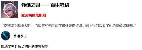 百里守约在前段时间由于射程的增加可以在防御塔外点塔,使用就采用了塔外点塔没有兵线的情况下伤害只有1的这一设定,目前由于防御塔的机制改动,所以取消了无兵线点塔的限制,但是射程并么有减少,所以是增强的,目前的百里守约也是非ban必选的存在,目前这一调整,虽然不是特别大的调整,但是超远的射程距离我相信以后一定会开发出不一样的打法。
