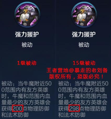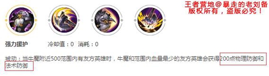 而牛魔,从技能描述看到,牛魔被动拥有200双抗,其实牛魔双抗是1级200点,没级提升7点,15级时候拥有最高298点双抗!