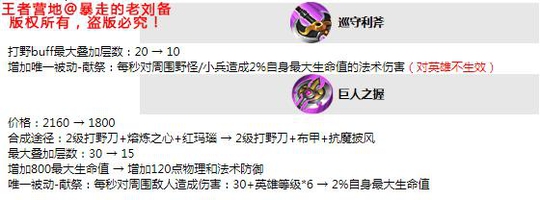 解析: 肉打野刀由原先的30层改为了15层,而减少15层就少了750点生命,但是另外弥补了对野怪的伤害。最重要的调整是,巨人之握增加120双抗和降低了价格!