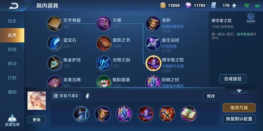 出装推荐:秘法之靴,圣杯,回响之杖,博学者之怒,巫术法杖,贤者之书