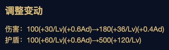 基础伤害有所提高,且护盾取消了Ad加成,基础护盾值和升级所加的都得到了很大的提高。