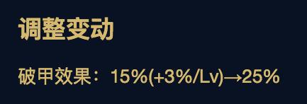 二技能的破甲效果由变动百分比调整为固定25%,这其实也是给了前期的黄忠一个很大的提升,这样一来,黄忠在前期就能够对敌方坦克或者是前排造成高额伤害。