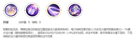 释放后会在指定位置和自身召唤出一个法力漩涡,被旋涡命中的敌人会减少法力值和血量,同时还会回复嫦娥自身的法力值,配合大招可以让大招打出更多的法力弹幕。而且这个技能让嫦娥有进入了野区的权利,清野速度无人能及,由于这个技能的施法距离很短,而且施法后法力漩涡的有效范围必须要贴身才能打出伤害,在线上对战传统的长手法师嫦娥会非常的吃亏,所以这里推荐嫦娥打野。(主加)