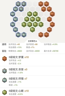 7个狩猎可以让嫦娥有更快的移速黏住敌人来保证法力漩涡和法力弹幕的命中,3个贪婪的法术吸血可以让嫦娥在野区基本无伤。心眼和梦魇增加法攻和法穿,法师通用铭文。