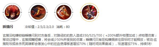 三技能顺镰闪:玄策在用2技能钩中之后才能使用2技能第二段和多段大招,大招的加成也特别的高200%的物理加成,用大招移动过程可以减少50%所受伤害。