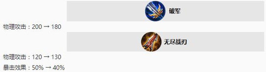 两个高输出的装备进行了调整,破军下调20物理攻击攻击,无尽虽然上调了10点物理攻击,降低了10%的暴击效果,打1000的暴击伤害就少了100.攻击有点小折扣。无尽电刀在众多热门出装中消失了,取而代之的是宗师和名刀这些比较常用的装备。攻速暴击流派的玄策也开始转型