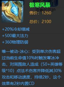 提供冷却减缩、最大法力值和物理防御,被动效果在受到的单次伤害超过当前生命值10%的伤害的时候,会对周围的敌人造成法术伤害并且降低其移速和攻速,持续两秒。