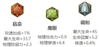 项羽现在的输出能力和坦度都非常高,因为之前的改版增强了项羽的基础生命值,让项羽在前期的生存能力更高了。所以项羽可以携带铭文鹰眼来增强自己的伤害,鹰眼配合大招的输出能够让项羽的伤害变得非常可观。宿命提供的攻速能够让项羽打出更多的普攻,调和的最大生命值和生命回复的加成都是提升项羽的抗伤能力和续航能力。