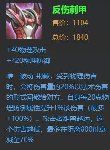 提供物理攻击和高额物理防御,被动效果:受到物理伤害的时候,会将伤害量的20%以法术伤害的方式返还给对方。同时自身每20点物理防御就会增加1%该伤害,攻击者的距离越远这个伤害就会变得月底,最多衰减至70%。