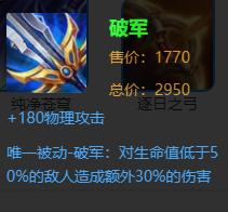 解析:项羽现在的输出能力也非常可观,出了前面的肉装之后项羽的坦度已经非常高了,这个时候可以补充一件破军来增强项羽的伤害能力。在突进到敌方后排的时候让项羽对敌方输出英雄的威胁力度更大。
