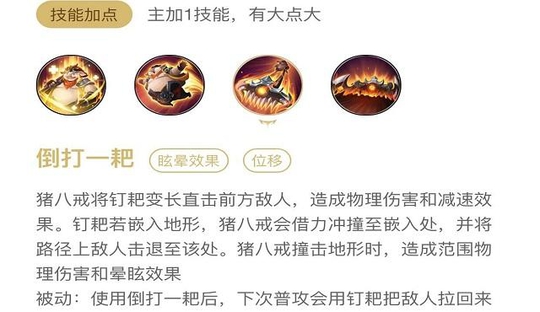 猪八戒钉耙变长对敌人造成伤害和减速效果,若接触地形会接力冲撞并将敌人击退到此造成范围伤害和眩晕。被动使用技能后的下一次普攻会将敌人拉回来。