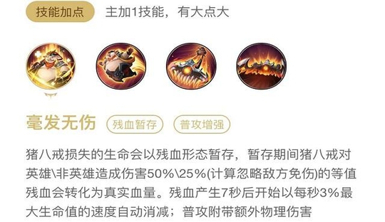 猪八戒损失的生命会以灰血形式暂存,期间猪八戒的敌方造成的伤害会通过一定比例让灰血转换为真实血量,普攻附加额外伤害。