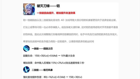 优化了1技能的生命回复,改为了百分比回复血量,不再依赖于AD加成,让铠的对线期回复能力大大提升。同时增加了命中敌人后的攻速加成,让铠接下来的平A输出更加顺畅。同时修改了2技能的强化普攻,在前期没有AD装备加成的情况下,可以依赖等级和基础伤害,依然能够打出不小的输出。