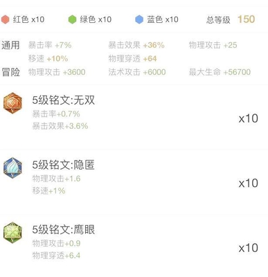 这样就搭配上面的暴击出装,让暴击伤害达到最大的效果,无双铭文的搭配也主要是为了配合宗师无尽打出高爆发的输出伤害,找准机会秒掉敌方C位,上面的出装只要抓到机会,2刀一个小朋友。