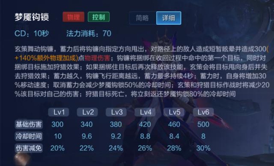 钩镰的长度会随着蓄力的时间而增长,释放二技能丢出钩镰并勾住回收过程的第一个目标,勾中目标后只能通过拉开距离扯断或等到钩子持续时间结束。被勾中的目标对玄策造成的伤害会减少最多30%,在此期间如果被勾中目标死亡将返还二技能80%的CD。当被勾中目标在范围内可将其甩向身后,甩飞的过程中无法动弹,使用后二技能将直接进入CD状态。钩子的命中率会直接影响玄策的作战能力和生存能力。