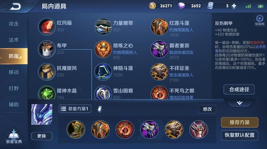 白起的铭文选择为:10调和+10宿命+10虚空,这套铭文可以增加白起前期的线上回复能力与1000生命值,间接提升了白起一技能的伤害非常适合白起。出装是:布甲鞋+红莲铠甲+不死鸟+霸者重装+不祥征兆+反甲,大后期可将鞋子换为复活甲。
