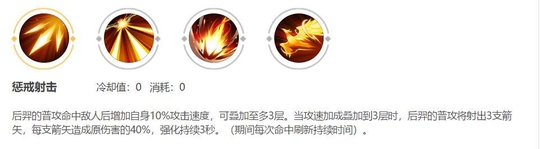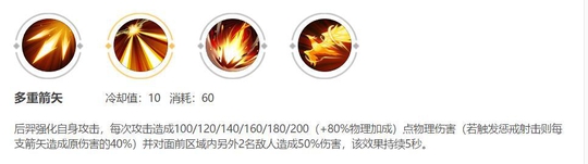 技能解析: 后羿在一定时间内连续普攻三下后,攻速提升30%,且会分裂为3支箭。这使得后羿在团战中是一个AOE的射手。这个被动buff非常重要,后羿之所以强,就是因为这个被动。小编亲测过多次,在没有这个被动的情况下和同装备的鲁班,狄仁杰等英雄对射,是打不过的,但是有这个被动的时候谁也比不过后羿。所以后羿在参团前可以先点两下小兵,触发被动后再去找敌方英雄打。在单挑的情况下用,没有这个buff,很容易被敌方英雄顶着你的输出来强杀你,等你被动触发你也差不多凉凉。这个被动触发被动后,伤害没得说。