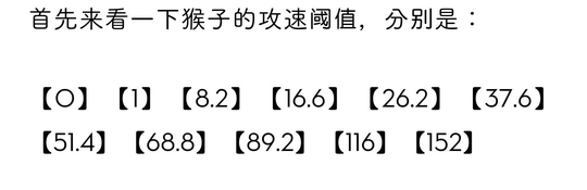 猴子的攻速阈值一共有11档,只有猴子的攻速大于每个区间的开头,实际攻速才能表现出来。也就是抬手更快,出击更快。