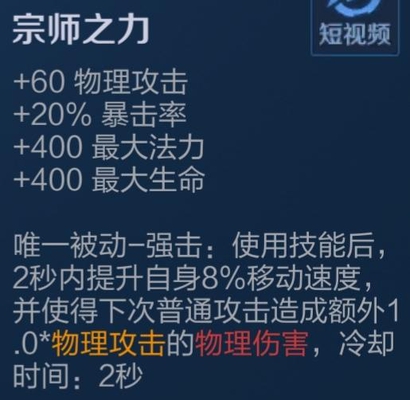 宗师提供60点物理攻击,20%暴击率,400点最大蓝量,400点生命。被动的强击效果为:使用技能后,2秒内提升8%移速,同时下一次普攻附带额外 1*物理攻击的物理伤害。冷却时间2秒