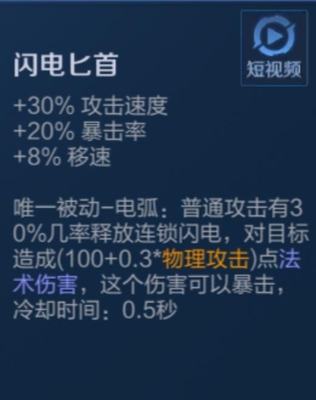 电刀可以提供猴子20%暴击率,30%攻速和稳定的8%移速加成,此外被动普攻会有30%几率触发闪电效果,可对目标造成(100+0.3*物理攻击)点法术伤害,冷却时间:0.5秒