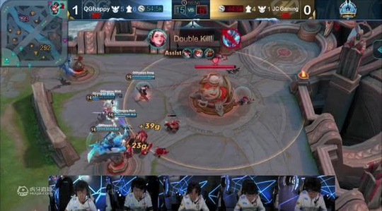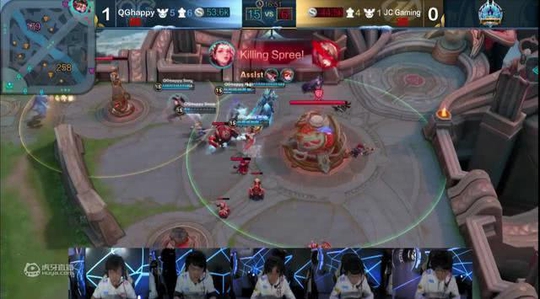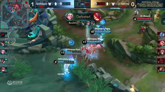 比赛进行到16分38秒,QGhappy攻上JC高地,伪装杨玉环一个大招加一技能助刺痛马可波罗击杀JC.老王鬼谷子,然后一个二技能收掉残血青浪米莱迪,最后击杀JC仅剩的怼怼白起,拿下双杀,团灭JC,并一波推掉水晶,拿下比赛胜利!