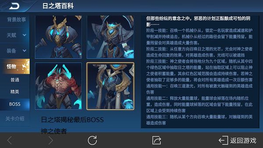 通道开启之后就会来到最终boss这里了。只要是通过了第四关的boss,最后一个也是没有太大问题的,最后一个boss比第四关的多了几个技能。重点介绍一下最后一个boss,技能如图,给大家说一下特别需要注意的。