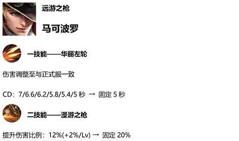 解析:回调了23日所增加的一技能伤害,调整了一技能CD固定为5秒,达到了正式服满级时的冷却收益。二技能调整了二技能被动提升伤害比例,固定为20%,加强了前期的作战能力,也是达到了正式服满级时的收益。相比现在正式服马克前期无力,发育周期长的问题已经得到了很大的改善,大大增加了马可的上次机会,毕竟以前的野区霸主可不是好惹的,现在的马克射程经过上次的更新调整也受到了加强,再配合本身高的机动性,补上了发育周期长的短板,简直是要崛起的节奏。