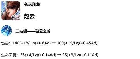解析:23日的改动中吧二技能的三段伤害改为四段,并增加了对兵线和野怪的回复效果,大大增加了赵云的生存和作战能力。而24日调整中,首先降低了二技能的伤害收益,其次降低了二技能的回复效果,不过相比起来二技能的四段伤害还是比正式服的三段伤害要高,而根本的二技能带来的生命回复没有移除,也没有改动触发的条件一旦更新到正式服中赵云的续航能力得到了一定程度的解决,也是史诗级的加强,毕竟现在的赵云打完野四级后基本会掉四分之一左右的血,严重影响到前期小龙的争夺。