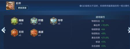铭文推荐 :10鹰眼 5狩猎 5夺萃 6无双 4祸源