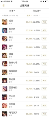 后羿在维持53%左右高胜率的前提下,出场率已经突破60%,毫无疑问是峡谷中目前最火热的英雄;与之类似的狄大人,维持高胜率的同时,出场率从10%剧增到接近20%。