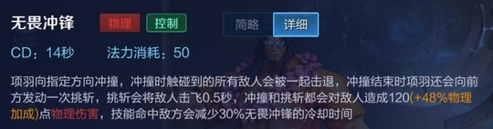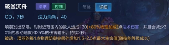 二技能:造成敌方的移动速度和输出伤害的减少,范围较广,配合一技能进场之后使用效果更佳。被动使项羽的物理防御额外增加最大生命值,进一步提升坦度。