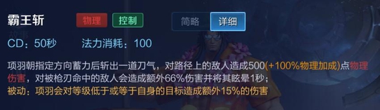 三技能:短暂蓄力挥出刀气,对面前大范围敌方造成伤害,被枪刃命中的敌人会造成额外66%伤害并将其眩晕1秒,是很强势的团控技能,可以利用一技能进场,靠近敌方时释放效果更佳。被动,项羽对等级低于或等于自身的敌方造成额外15%的伤害,等级对项羽来说很重要。
