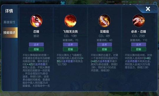 一技能(飞翔龙炎阵)不知火舞对范围内敌人造成伤害并击飞二技能(花蝶扇)不知火舞扔出扇子对敌人造成伤害和减速效果,同时削减敌方魔法抗性3秒。大招(必杀·忍蜂)不知火舞向前冲刺对敌人造成伤害和击退效果,同时减少敌方一定攻击力2.5秒。