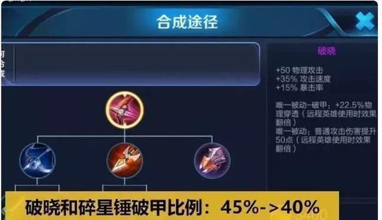 首先我们来看新赛季的几条改动,第一,破晓、碎星锤的穿甲都从45%变成了40%,破晓加20%的穿甲,远程英雄翻倍。破军的攻击降低,从200变成180。无尽战刃,攻击增加了10点,但是强化暴击的效果降低了10%。