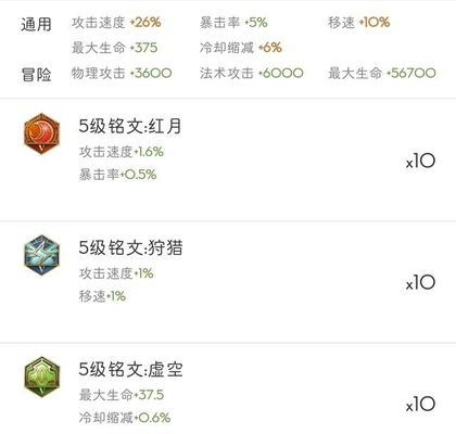铭文上推介蓝色狩猎,绿色虚空,红色红月。由于吕布一技能附魔后,主要的输出手段就是普攻,所以吕布配攻速铭文可将伤害最大化。绿色上不考虑鹰眼是因为吕布有真实伤害,并不需要穿透。所以虚空的生命值加成和冷却都非常适合他。